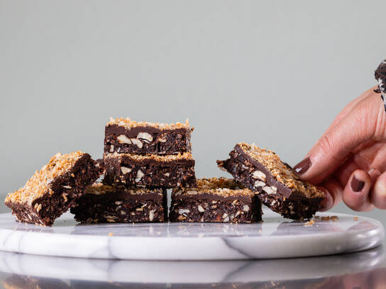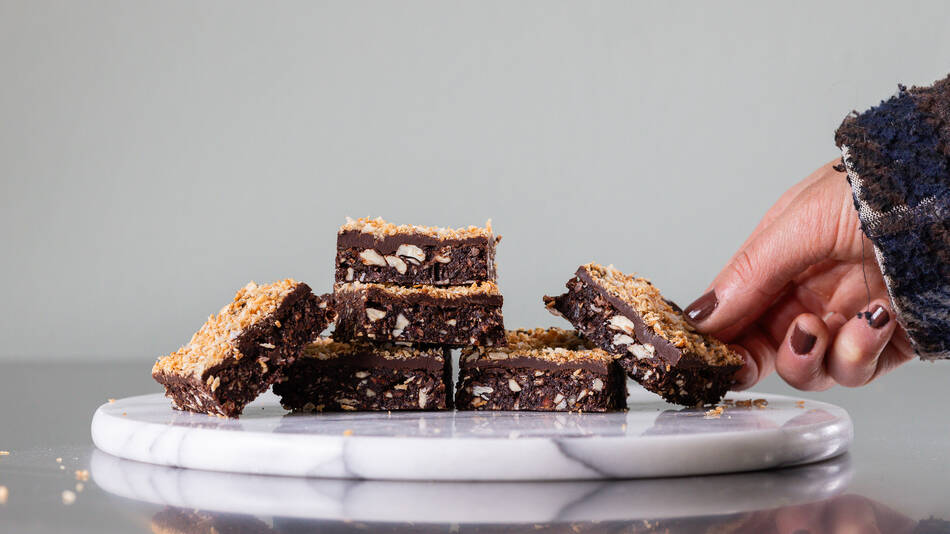 - Tag din raw brownie ud fra køl og fordel chokoladen herover. Drys med ristet kokos samt flagesalt. Sæt på køl indtil chokoladen har sat sig og skær herefter i ønsket størrelse. Opbevar rester i lufttæt beholder på køl i op til 1 uge.
