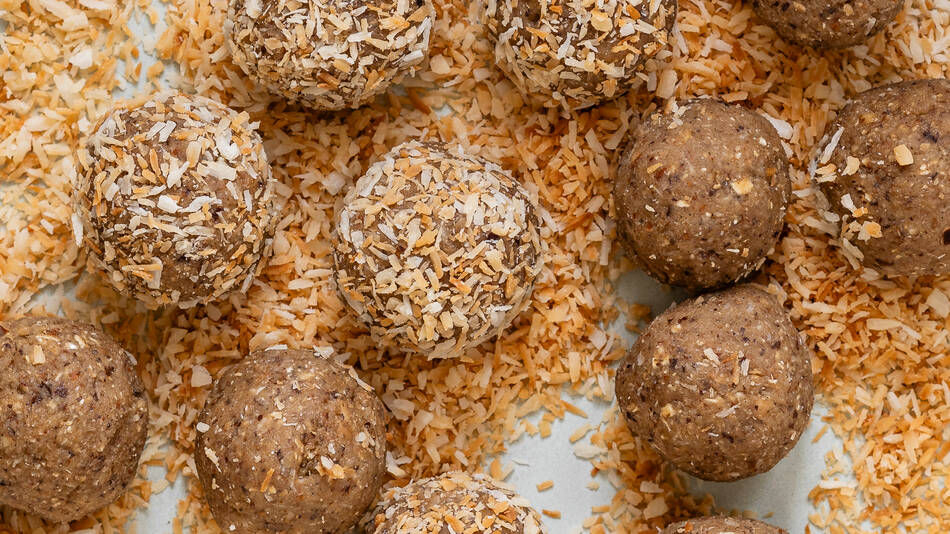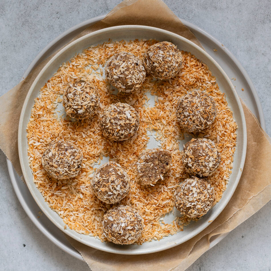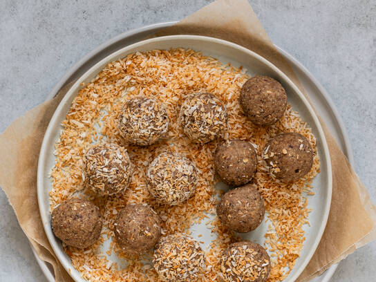 Form din dadelmasse til kugler, og tril dem i ristet kokos eller - for en luksusversion - i smeltet mørk chokolade