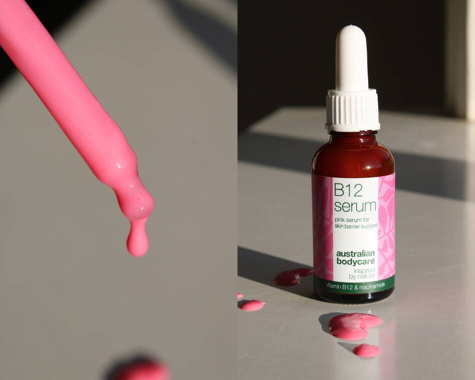 Blandt andet Australian Bodycares Vitamin B12 Pink Serum. Det lyserøde serum er udviklet til at styrke hudens naturlige barriere og reducere rødme. Her er vitamin B12 en vigtig spiller, da vitaminet blandt andet bidrager til en normal cellefornyelse og elasticitet i huden.