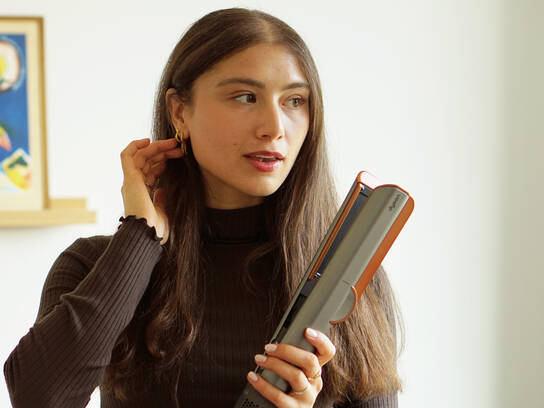 1: Klem styleren sammen rundt om en hårlok. Det er lige meget, om dit hår er tørt eller vådt, for Dyson Airstrait kan glatte både tørt og vådt hår.