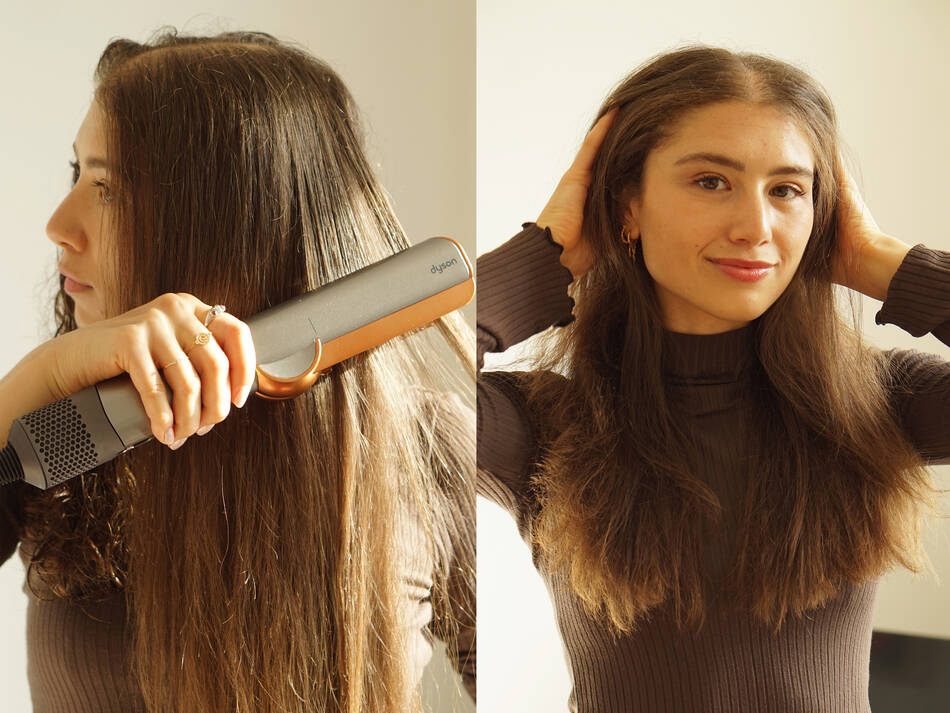 På fotoet kan du se, hvordan Dyson Airstrait bruger varme luftstrømme til at både tørre håret og glatte det på samme tid. Resultatet taler vist for sig selv!