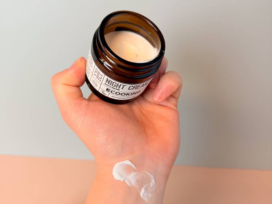 Konsistensen på natcremen er tykkere end dagcremen, og den føles fløjsblød på huden.