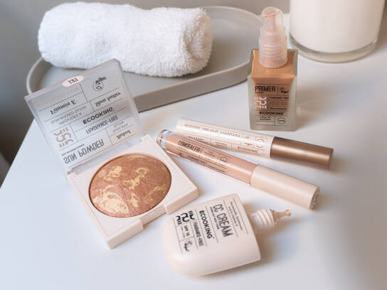 Brug ECOOKING Primer i hele ansigtet som det første. Den giver fin glød og får de næste makeupproduker til at sidde pænt og jævnt på huden.