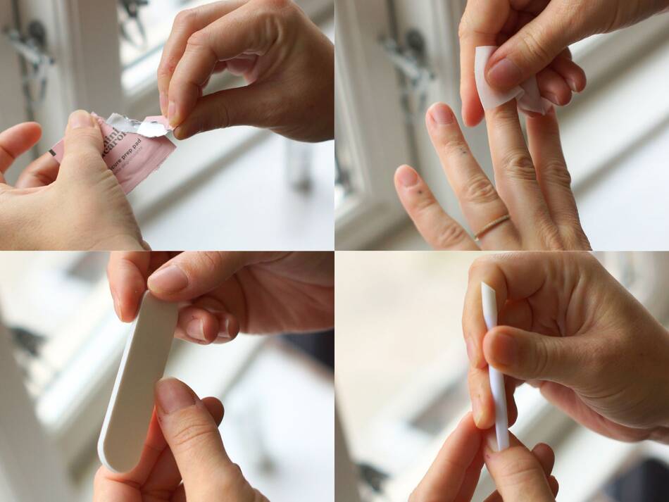 Step 1 til smukke clean girl nails er en grundig prep af neglene. I manicure kittet fra le mini macaron får du både wipes, fil og neglebåndsskubber.