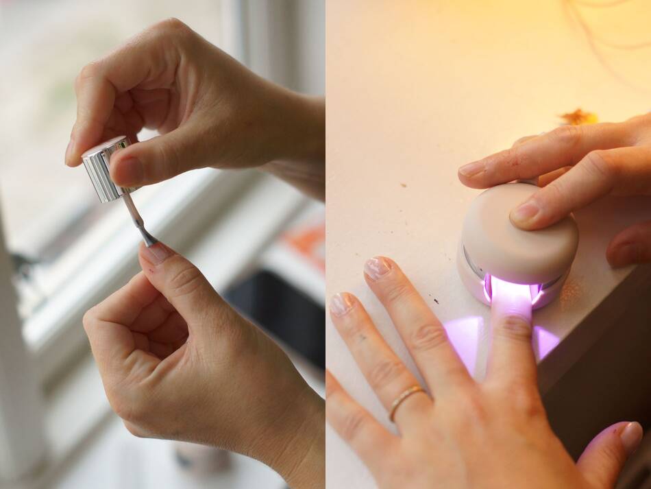 Step 1 er nail polish. Brug gerne LED-lampen til at tørre lakken efter påføring på hver enkelt negl.