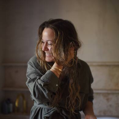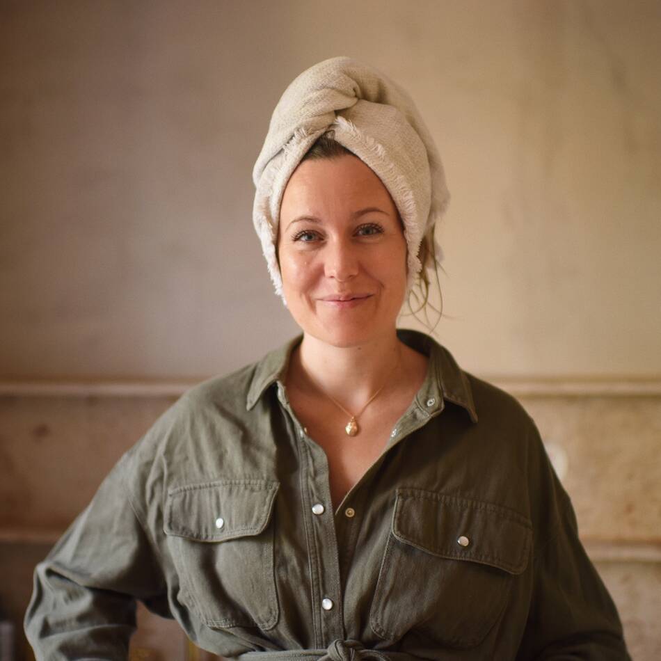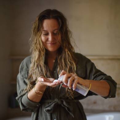 Tryk Matas Curl Cream ud i hånden og varm den let op i håndfladerne. Fordel den derefter i håret ved at kramme den ind nedefra og op i sektioner.
