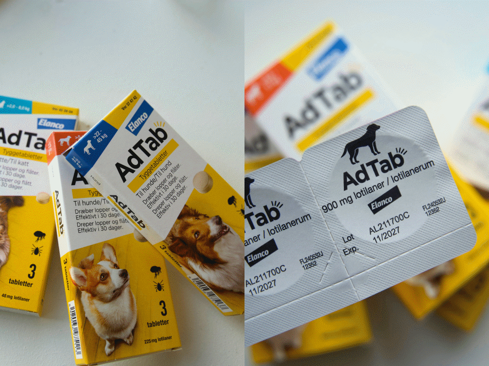 Tabletterne er med smag og kan gives direkte i hånden eller sammen med foderet, hvilket gør dem nemme at administrere. AdTab anvendes både ved konstateret angreb og som løbende månedlig beskyttelse i perioder med øget risiko for flåter og lopper.