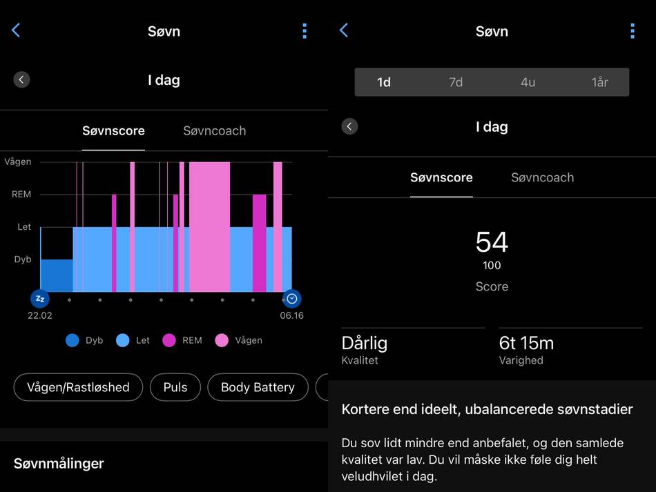 Mit Garmin-ur giver anbefalinger til søvn og restitution. I nat har jeg brug for en lidt mere normal søvn!