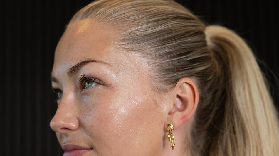 Da Glass Skin-looket skal være naturligt, dupper jeg den kun på kinderne og i T-zonen. Dup forsigtigt, så du ikke fjerner de plejende produkter og det glasklare finish fra hudplejerutinens tidligere steps. Vælg gerne en lysere nuance i forhold til din hudtone, så du undgår, at du laver contour.