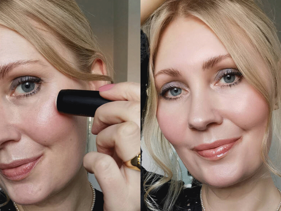 Først lægger Pia den fløjsbløde creamy touch highlighter på kindbenene. Det tilføjer et champagnefarvet, glansfuldt touch, som passer supergodt til resten af looket. Highlighteren har en perlemor-effekt, der reflekterer lyset og giver en strålende glød. Den cremede tekstur gør det let at påføre highlighteren på en naturlig måde, da den lægger sig jævnt og glat på huden.