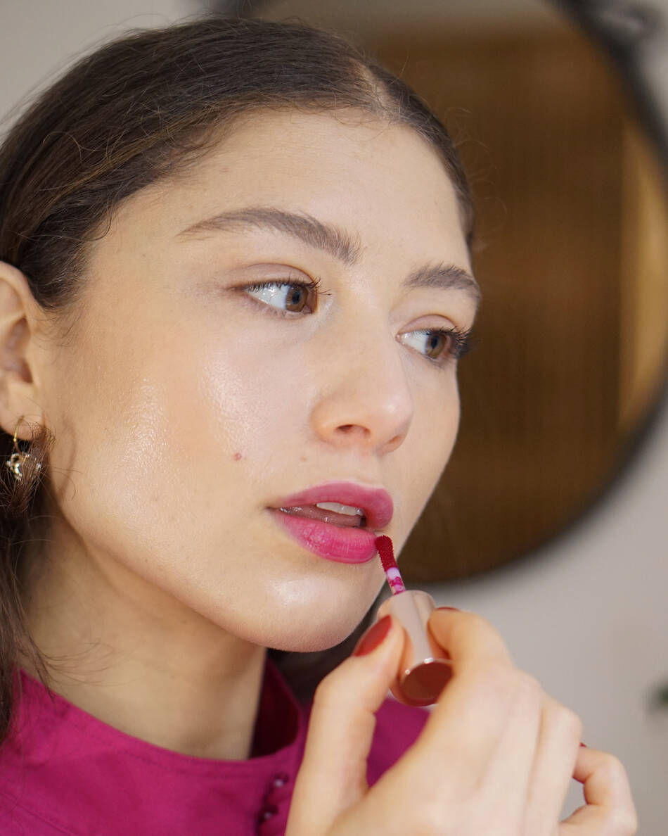 Til dette læbelook bruger jeg som det første en lip stain. Det er en særlig form for læbeprodukt, der fungerer lidt som en fusion af en læbestift og en lipgloss. Den er flydende som sidstnævnte, men har en holdbarhed som førstnævnte. Hvor mange andre læbeprodukter er designet til at lægge sig oven på læberne, er det særlige ved en lip stain, at produktet absorberes af læberne. Det gør, at farven ikke smitter af på samme måde som for eksempel en læbestift, og så holder den længe på læberne – selv gennem frokosten.