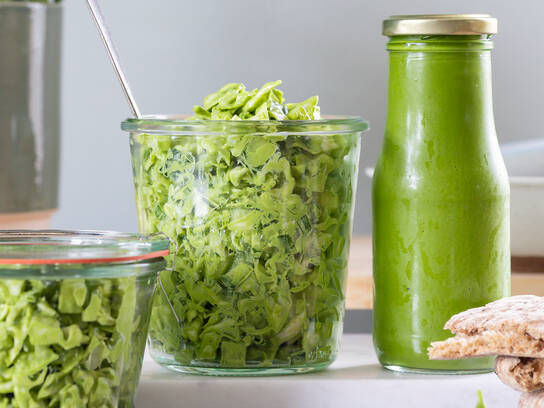 Denne salat er ikke bare en fryd for øjet, men også en fornøjelse for smagsløgene. Den kombinerer de sprødeste grøntsager som spidskål og agurk med en grøn cashew-dressing fyldt med spinat, basilikum og et frisk touch af citron. Perfekt som tilbehør, i en sandwich eller som en hurtig snack med tortillachips.