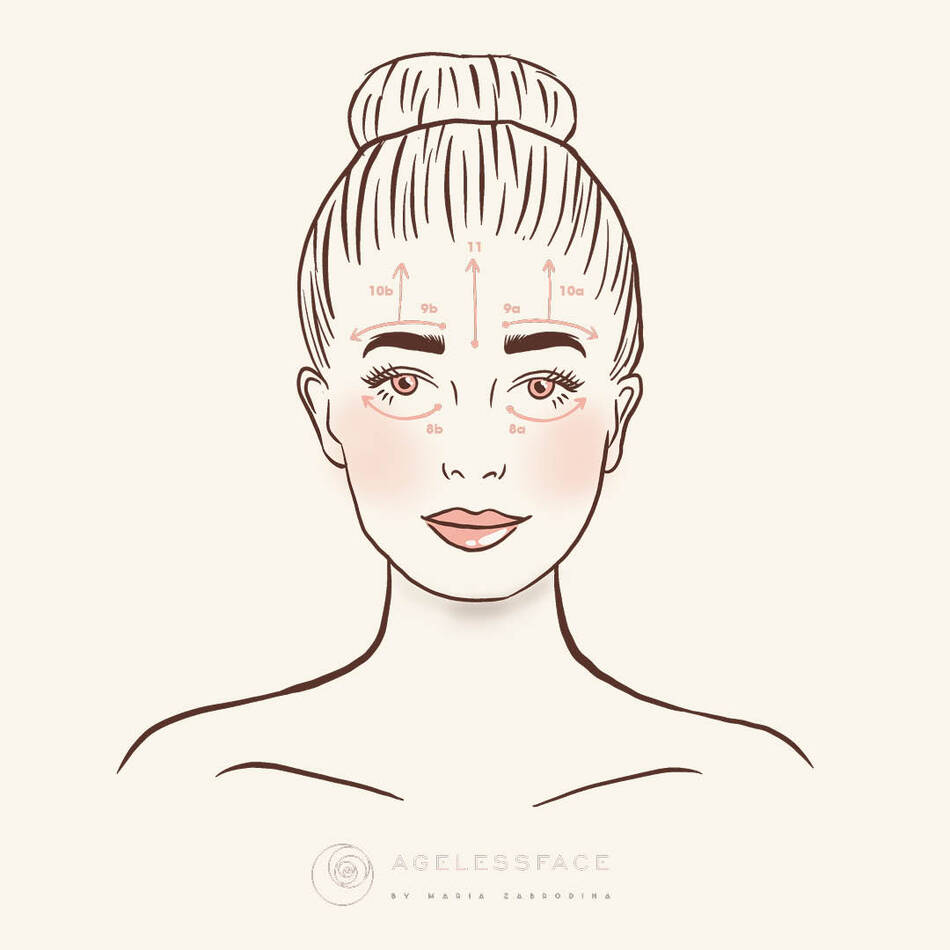 - Læg Gua Sha stenen fladt over brynet, og træk op mod hårlinjen, indtil du møder den som vist herunder
