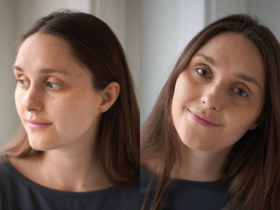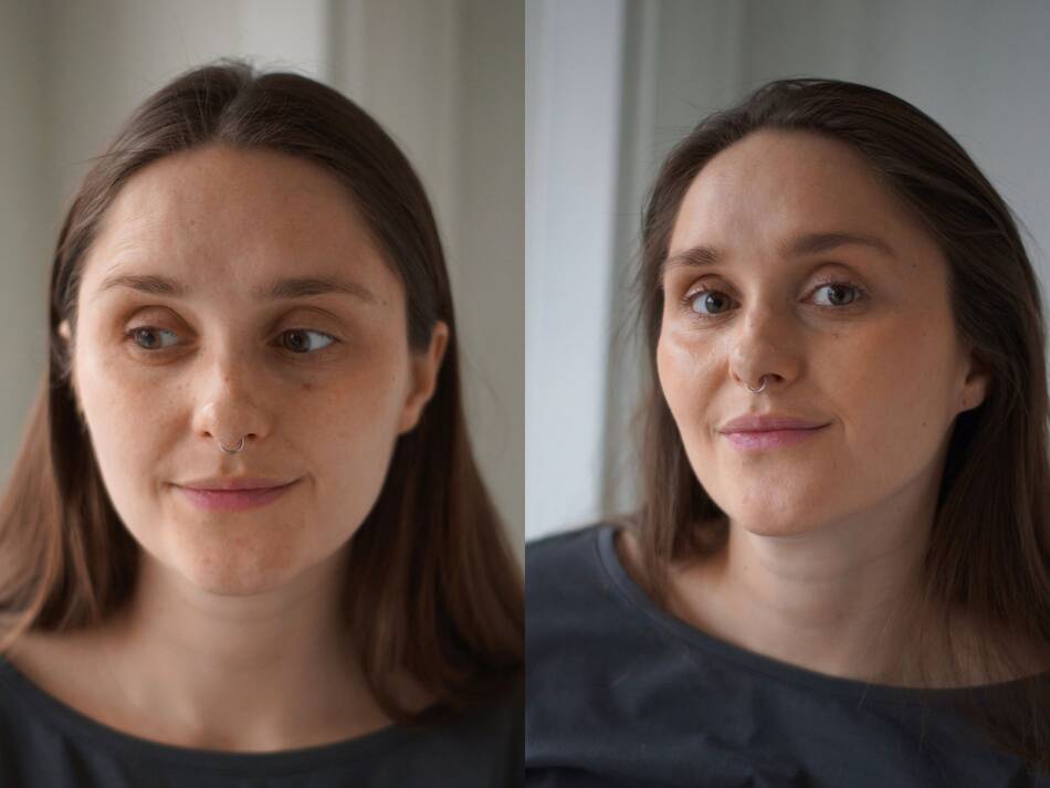 Før og efter: Denne her CC-cream giver et tydeligt mere jævnt udseende på min hud og har et mat finish.