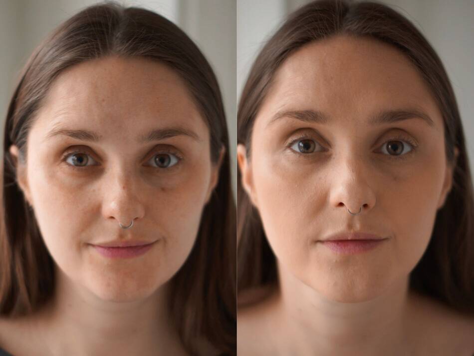 Før og efter: SÅ meget naturlig glød! Min hud bliver synligt mere jævn, men mine fregner og min naturlige glød får lov til at skinne igennem.