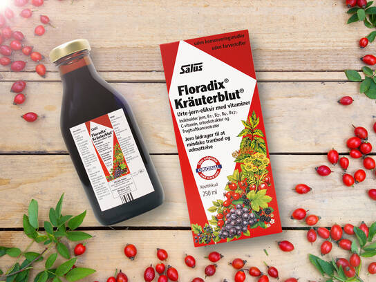 Floradix Kräuterblut er en urte-jerneliksir med vitaminer, der inderholder organisk jern II fra jernglukonat, riboflavin, vitamin B6, B 12 og C, som bidrager til at mindske træthed og udmattelse og til en normal produktion af energi i kroppen – et såkaldt normalt energistofskifte.