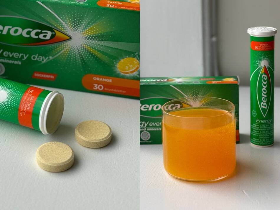 Kosttilskud fra Berocca har en frisk smag af appelsin, og indeholder 11 vitaminer og mineraler, inklusive alle otte B-vitaminer. Put tabletten i et glas vand og få en forfriskende, brusende drik. Kosttilskuddet indeholder blandt andet Vitamin C, B2, B12, niacin, pantothensyre og magnesium, som bidrager til at mindske træthed og udmattelse. Det indeholder derudover pantothensyre, som bidrager til en normal mental ydeevne.