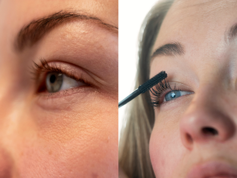 Til venstre ses et før-billede og til højre ses et efter-billede efter påføring af mascaraen. Den smalle børste på mascaraen gør det nemt at komme helt ned til roden af vipperne.