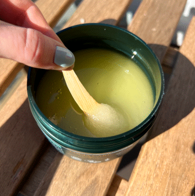 Når du åbner produktet, er olien og saltet skilt fra hinanden, men det er altså ikke fordi, der er noget galt. Her er et godt tip at lukke beholderen godt til og ryste produktet inden brug, eller lige røre rundt i det med den medfølgende træ-spatel. På den måde fik jeg i hvert fald mikset produktet godt, så det var klar til brug i badet.