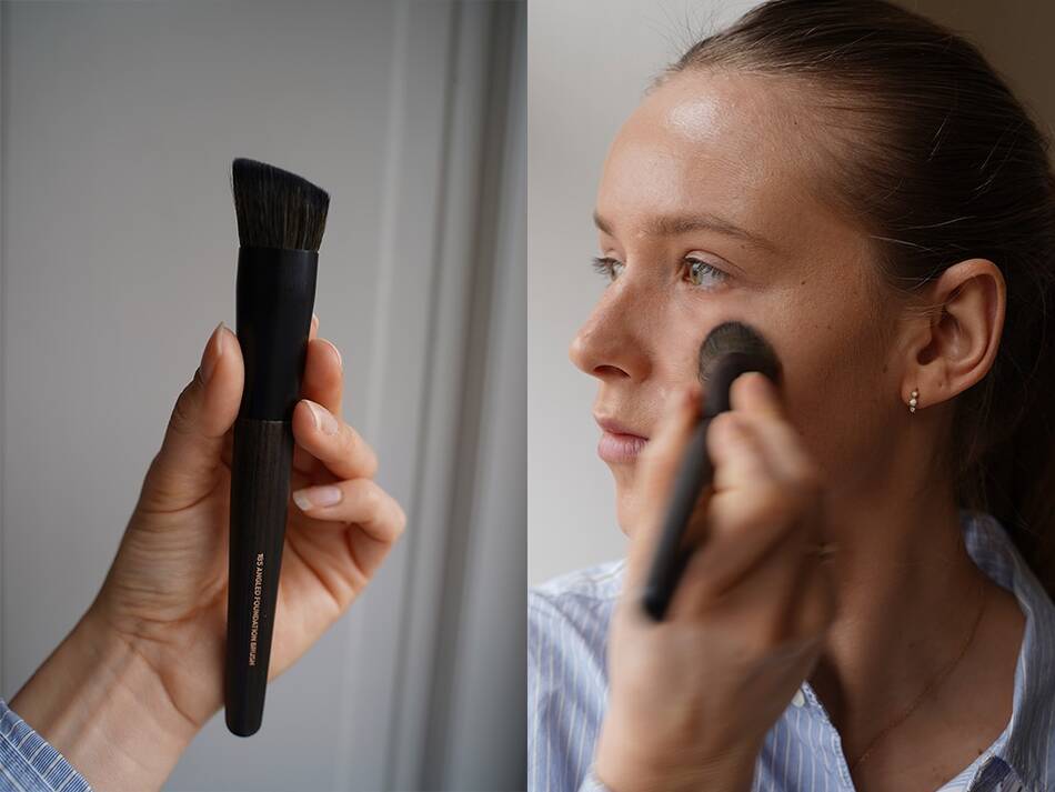 Jeg bruger Angled Foundation Brush her, og jeg har kun positive ord at sige. Den er så blød og lækker, og min foundation blender så pænt med min hud. Desuden var den meget nem at bruge. Jeg har desuden Nilens Jord Second Skin Serum Foundation på her.