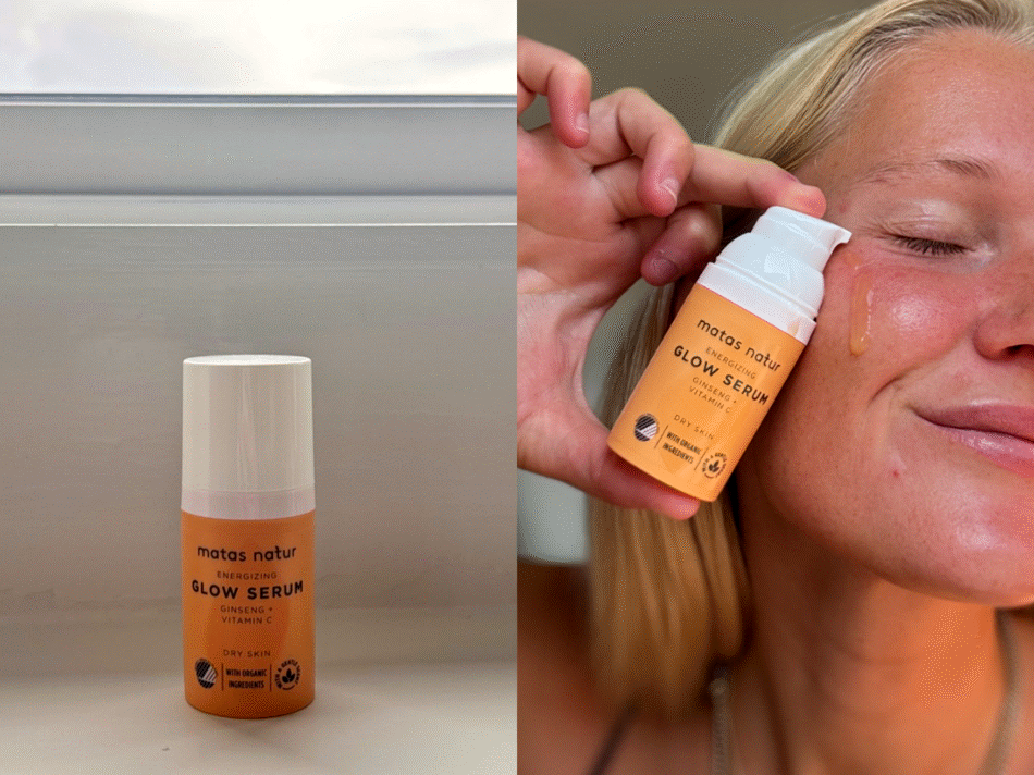 Når huden er renset, er det tid til at tilføre endnu mere pleje med Matas Natur Energizing Glow Serum. Serummet er let i konsistensen og trænger hurtigt ind, så huden får gavn af de aktive ingredienser med det samme. Her finder du blandt andet C-vitamin, der fremmer cellefornyelsen og hjælper med at udjævne hudtonen, niacinamide, der reducerer synligheden af porer og styrker hudbarrieren, samt hyaluronsyre, der binder fugten i huden og udglatter fine linjer.