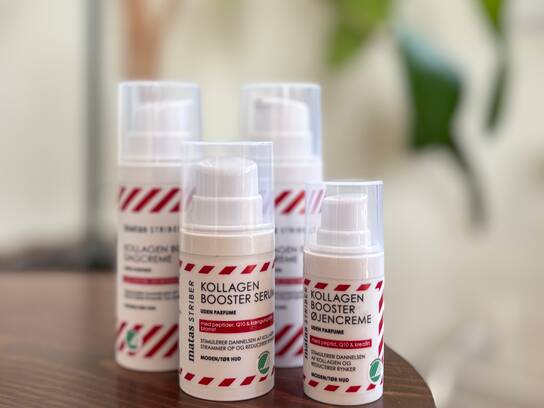 Matas Striber Kollagen Booster-serien er udviklet med fokus på moden og tør hud. Produkterne arbejder målrettet med at støtte hudens naturlige kollagenproduktion, samtidig med at de giver intens fugt og beskyttels.