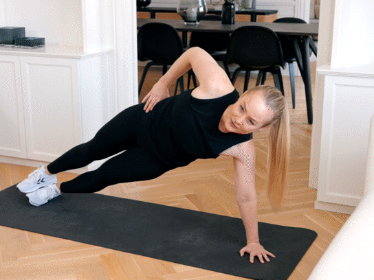 I denne øvelse træner du de skrå mavemuskler. Sørg for, at din hånd er placeret lige under skulderen, fokuser på ikke at tabe hoften, spænd op i core og vær stiv som en planke i hele kroppen. Hvis du gerne vil have en lettere version af øvelsen, så sæt det underste knæ i gulvet.
