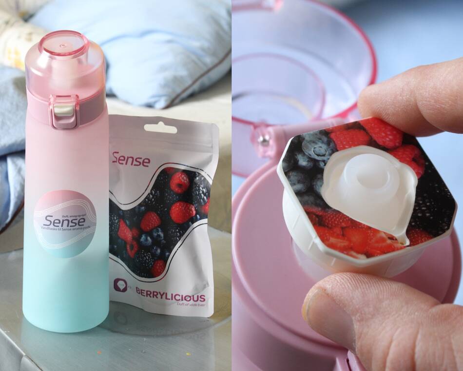 Vandflasken fra Sense ligner umiddelbart en helt normal vandflaske. Men vandflasken er designet til at kunne rumme såkaldte aroma pods, der giver dig en oplevelse af vand med smag af din favoritsmag. De fungerer ved, at de danner luftbobler med aroma i vandet, som dufter og på den måde giver dig illusionen af smag.
