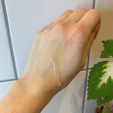 Olien indeholder intet mindre end otte forskellige olier: sød mandelolie, hypenroseolie, ricinusolie, olivenolie, jojobaolie, granatæbleolie, hindbærfrøolie og abrikoskerneolie. Når du kommer den ud i hånden, vil du opleve, at den dufter dejlig mildt, hvilket jeg synes har en afslappende effekt. Den er uden tilsat parfume, så duften er udelukkende fra de forskellige olier.