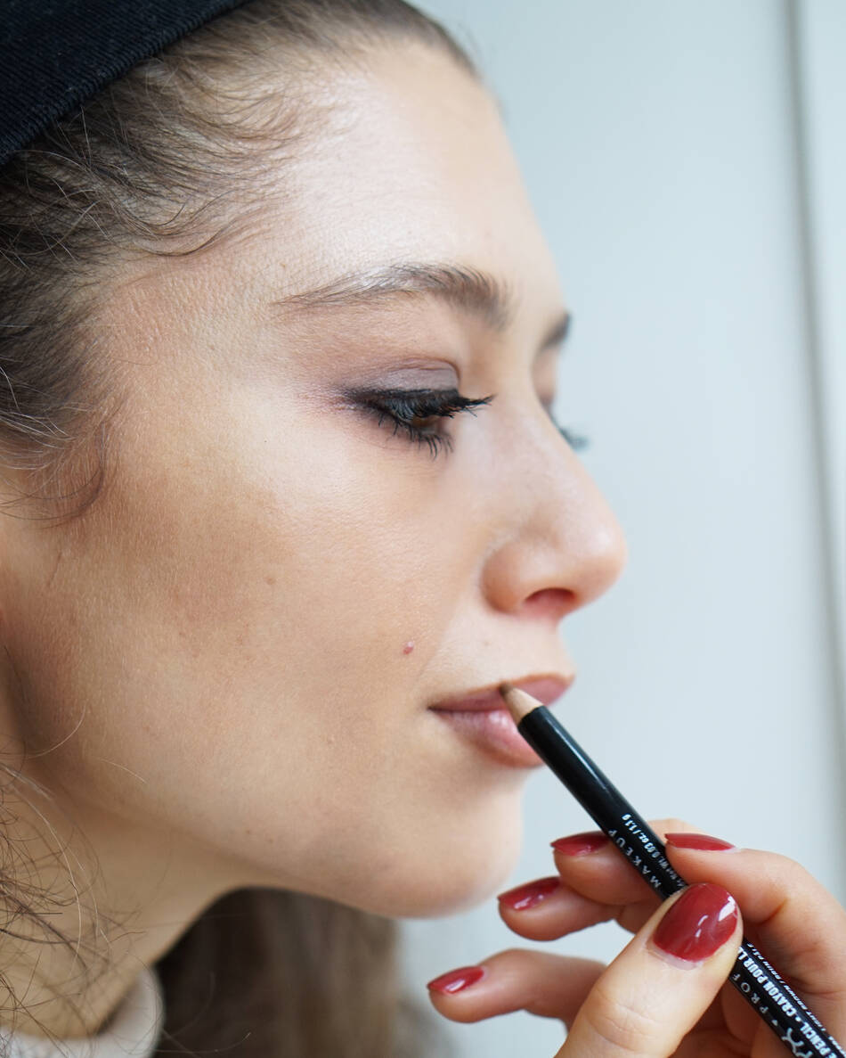 Når jeg liner mine læber, tegner jeg forsigtigt langs læbekanten; først den nedre, derefter amorbuen og til sidst siderne på overlæben. Nogle holder af at ’overline’ det vil sige få læberne til at synes større ved at tegne udenom dem. Hvis du holder af den trend og er god med en lipliner, kan du sagtens gøre det til looket.