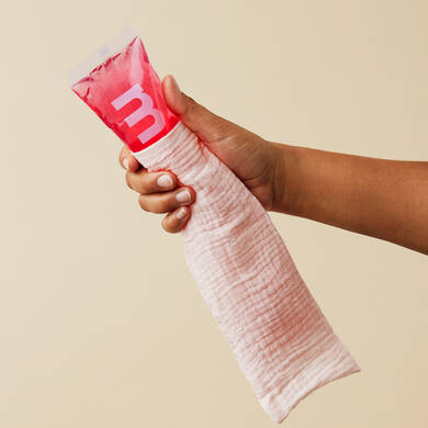 ’Når man har født, kan man være hævet og ekstrem øm omkring mellemkødet, og her kan det være rart med noget koldt på. Læg den i fryseren, og kom den i omslaget. Læg den herefter oveni bindet, så den ligger direkte på underlivet. Meget behageligt! Den kan også bruges til hævede bryster eller lindring af smerter ved brystbetændelse – der er mange muligheder!’