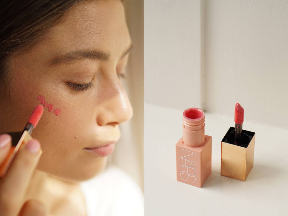 NARS' ikoniske 777 Orgasm-farve fås til både læber og kinder. Her bruger jeg NARS Afterglow Liquid Blush 777 Orgasm.