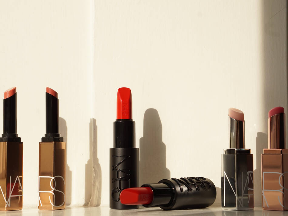 Tre af NARS’ ikoniske læbeprodukter: Afterglow Lipstick, Exlipcit Lipstick og Afterglow Lipbalm.