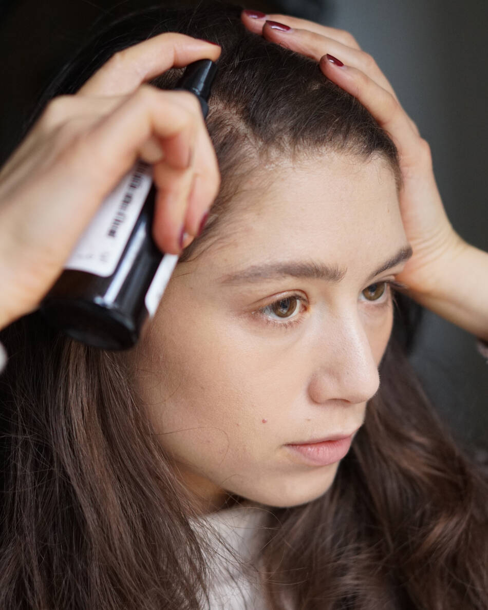 Påfør hårserummet helt nede ved roden af håret og massér det ind i hovedbunden. Serummet er vandbaseret, så du behøver ikke være bange for, at det fedter; for det gør det slet ikke.