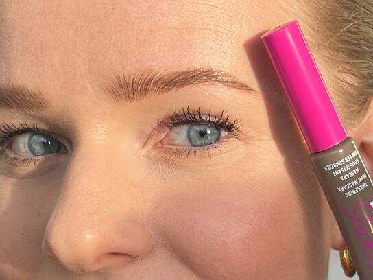 Jeg slutter looket på mine bryn af med denne lille sag. Jeg påfører den i brynenes retning, så den låser hårene helt fast. Du kan få Brow Glue med og uden farve.