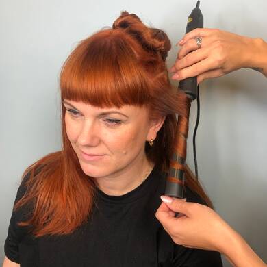 Brug derefter dit foretrukne stylingredskab. Vi bruger et klassisk krøllejern, men du kan med fordel også bruge et glattejern til at lave krøllerne med. Fordel håret i små sektioner og krøl dem én efter én.