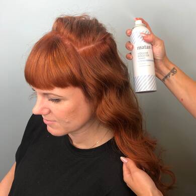 Spray på den færdige frisure i en afstand af 20-30 cm og fordel lakken – både på overfladen, men løft også gerne op i håret og spray det. På den måde sikrer du et mere holdbart look.
