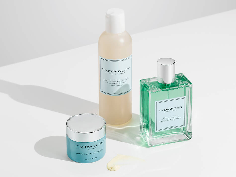 - Tromborg Herbal Cleansing Water er den, jeg ville tage med på en øde ø, fordi den renser, fugter og kan det hele. Den er olie- og alkoholfri, så det er kun økologiske urter, der gør hele arbejdet. Den er også fantastisk til teenagehud og til at få det gjort om aftenen, selv hvis man har drukket for meget rødvin – for det er bare et skvæt på en vatrondel, og så kan du gå direkte til din creme.