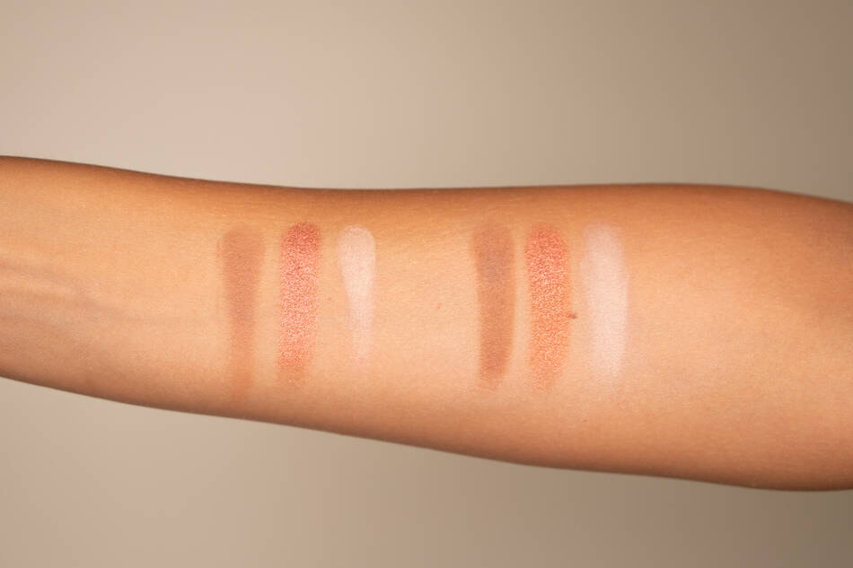 Til venstre ses 3 øjenskygger påført uden primer og til højre de tre samme øjenskygger med primer under. Påføringsmetoden er den samme, og der er anvendt ét stryg af øjenskygge for hver farveprøve. Bemærk forskellen i farveintensitet mellem de to påføringer, samt hvor meget jævnere øjenskyggen fordeler sig med en primer under - netop fordi primeren skaber det optimale underlag for din makeup. På øjenlåget gør det en kæmpe forskel, hvis man gerne vil have flere farver på og skabe forskellige effekter - eller bare ønsker en jævn påføring.