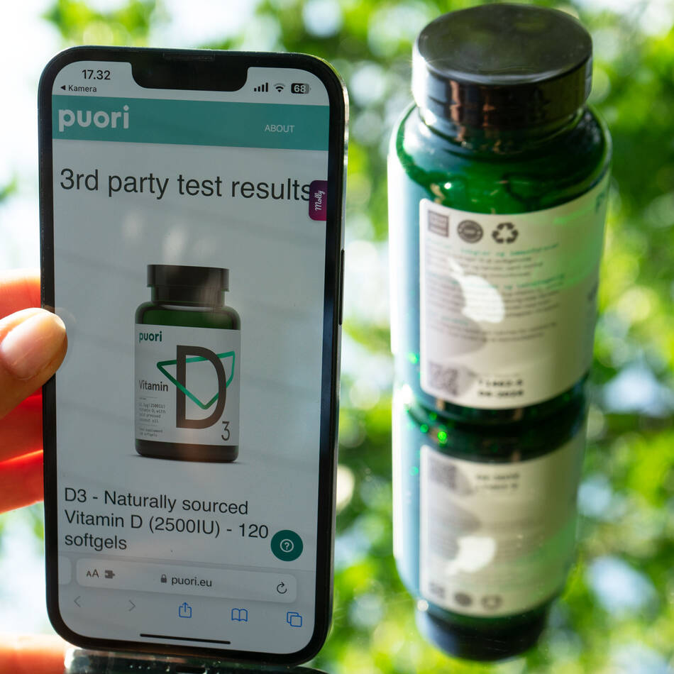 Når du køber et produkt fra Puori, vil du opdage, at det bærer en QR-kode. Når du scanner koden, kan du se de specifikke testresultater på netop dit produkt. Puori har dermed gjort det fuldstændig gennemsigtigt, hvad du som forbruger står med i hånden.