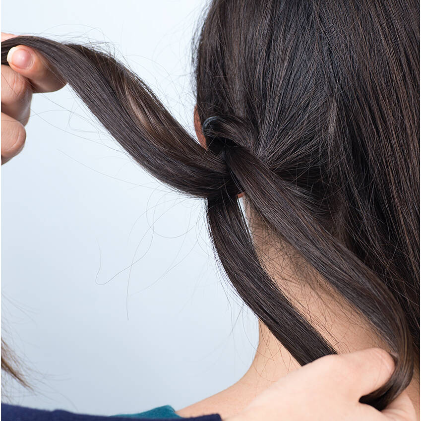 Sæt den bagerste tot, som nu er trukket igennem den forreste tot, fast med en hårklemme.