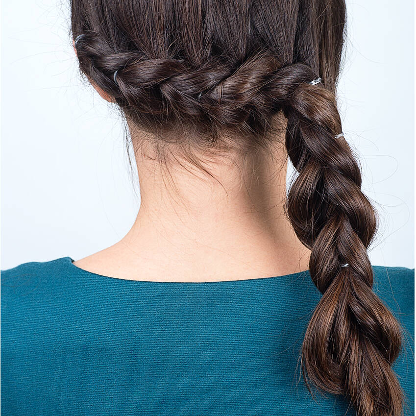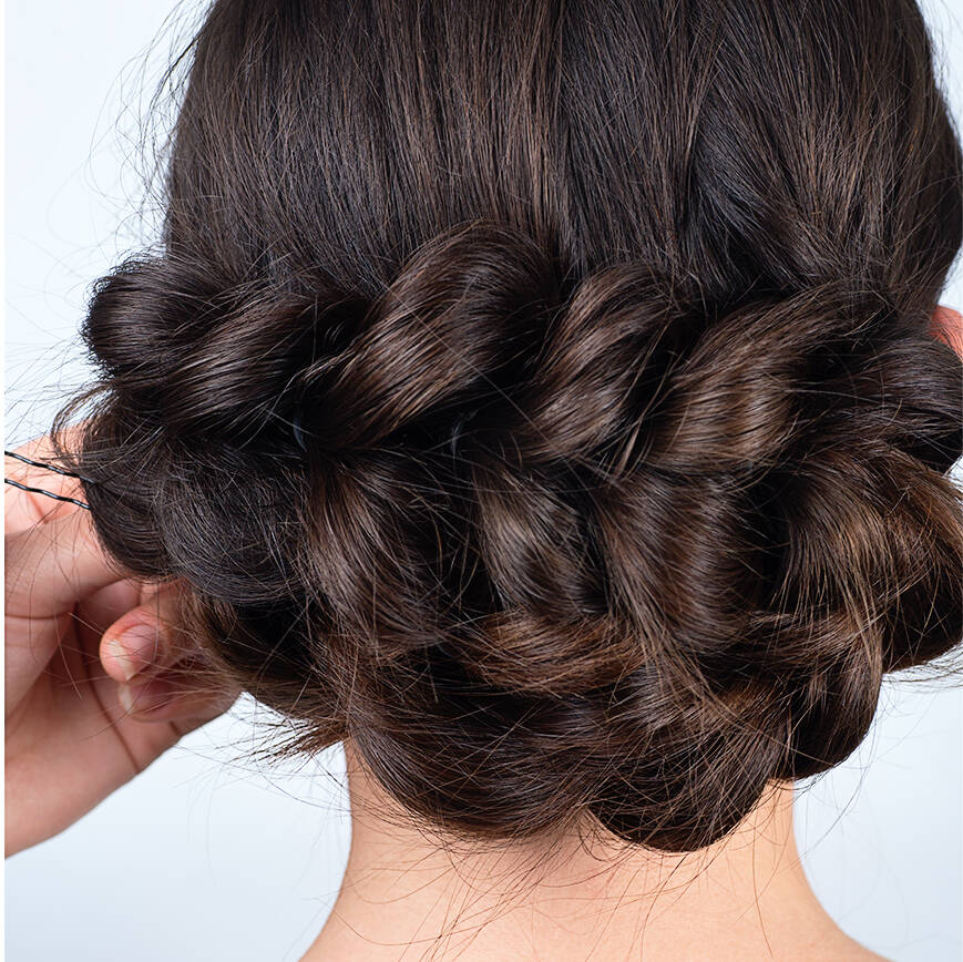 Alt du mangler er at folde den længden af håret op under det andet. Du ligger simpelthen bare den lange snoede tot op under den anden halvdel og sætter det fast med hårnåle.