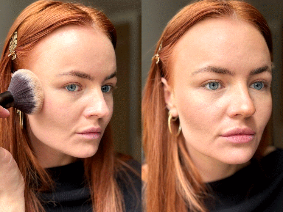 Her kan du se, hvordan pudderen efterlader huden mat uden at se tør ud.