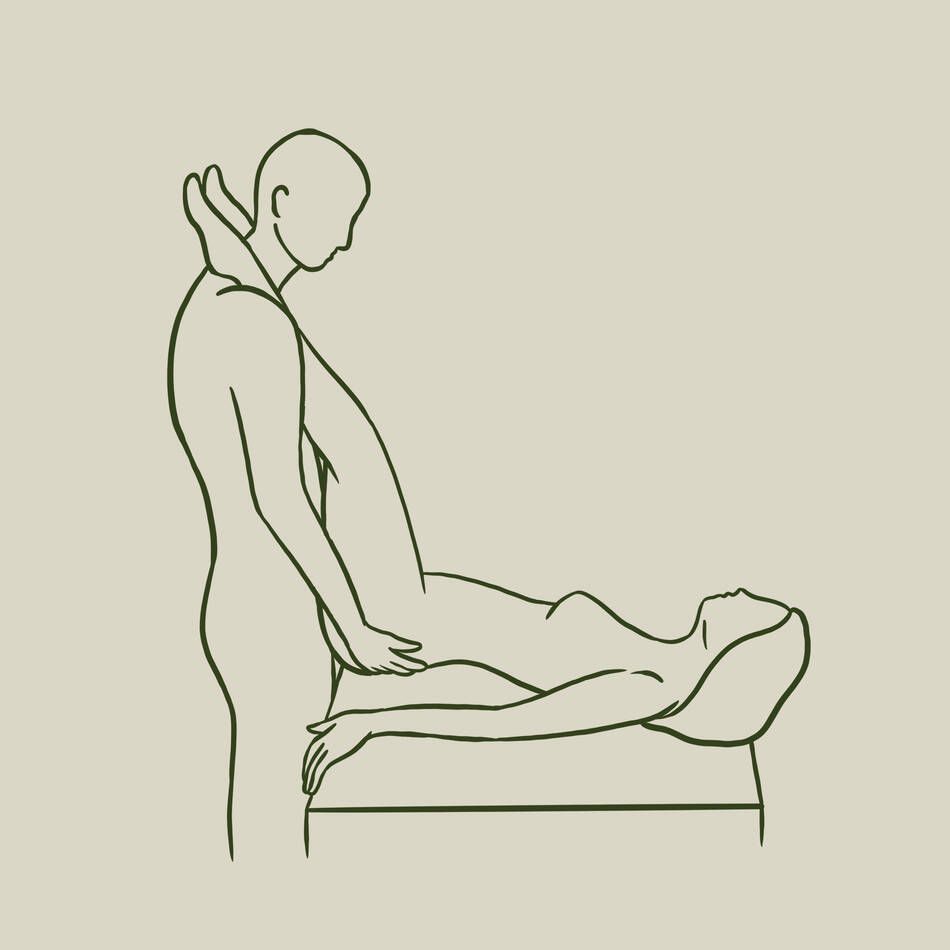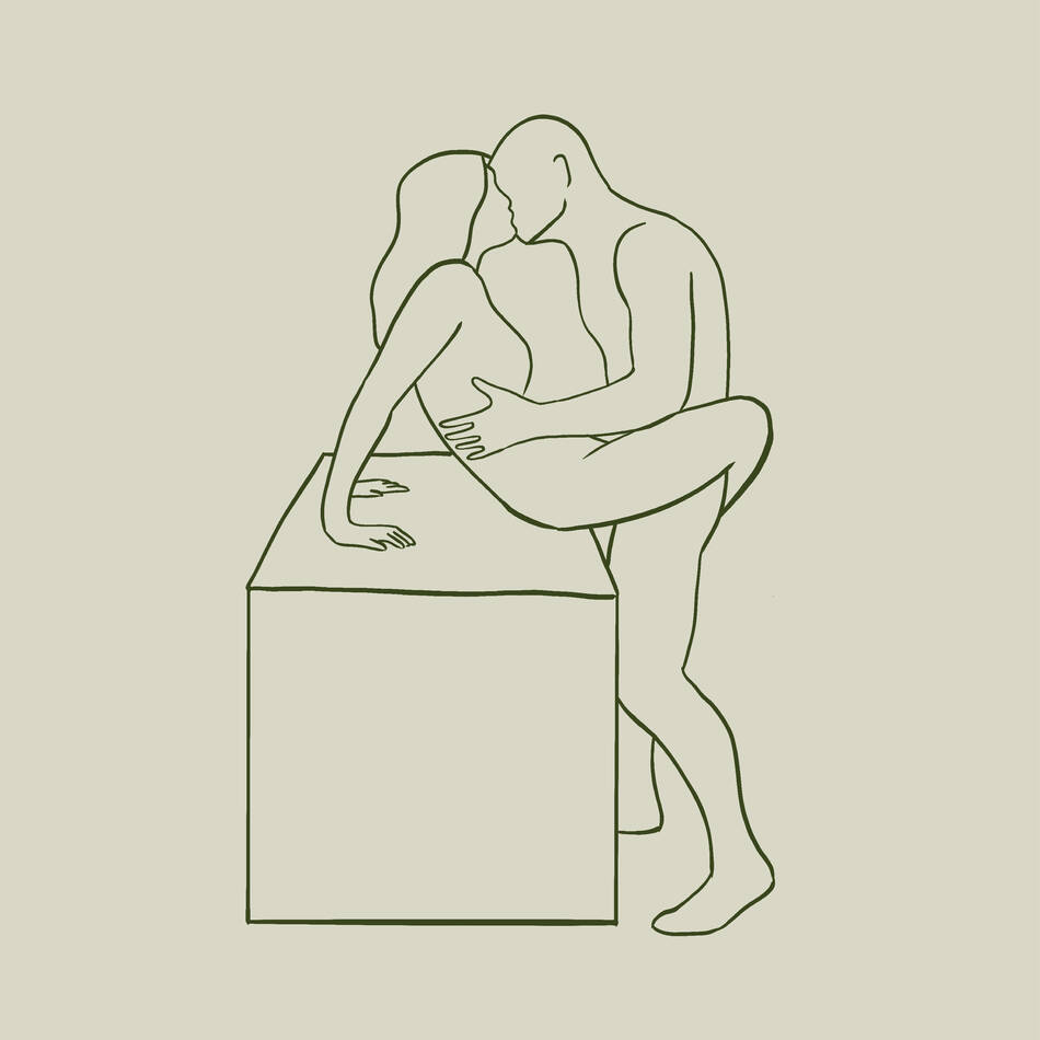 I denne stilling ligger modtageren på ryggen på en overflade, der er højere end en seng. Det kan fx være et spisebord eller andre steder, der passer til giverens højde. Giveren står på gulvet og penetrerer. Modtageren kan eventuelt løfte sine ben op på giverens skuldre, hvis det føles behageligt.