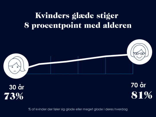 Barometeret viser, at 64 % af kvinder under 30 år føler sig glade, hvor hele 80 % af kvinder i 60’erne og 70’erne føler sig glade.