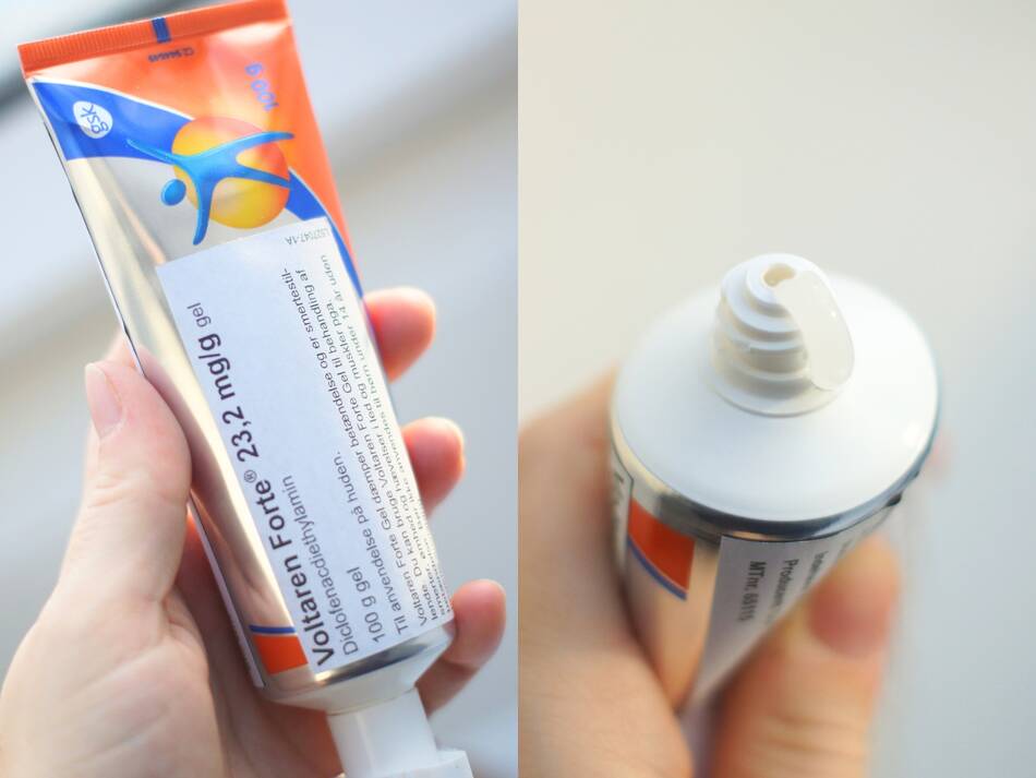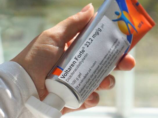 * Voltaren Forte (diclofenacdiethylamin), gel 23,2 mg/g. Anvendelse: Behandling af smerter, ømhed og hævelser i led og muskler pga. betændelse. Dosering: Voksne og børn på 14 år og derover: 2-4 g gel påsmøres huden 2 gange dagligt dér, hvor det gør ondt. Anvendelse i mere end 7 dage bør kun ske efter aftale med lægen. Forsigtighedsregler: Må ikke anvendes ved overfølsomhed over for indholdsstofferne eller anden medicin mod smerter (NSAIDs), i graviditetens tredje trimester eller til børn og unge under 14 år. Anvendelse på store hudområder over en længere periode bør kun ske i samråd med læge. Voltaren Forte kan påvirke nyrerne. Astmalignende anfald kan udløses hos personer, der har eller har haft astma eller allergi. Samtidig anvendelse af andre NSAIDs kan øge risikoen for bivirkninger. Må kun anvendes på intakt og sund hud, og ikke i åbne sår eller på beskadigede hudområder. Bør ikke komme i kontakt med øjne eller slimhinder. Må ikke indtages. Er ikke beregnet til brug under tætsluttende forbinding. Indeholder propoylglycol (E1520) som kan give irritation af huden, butylhydroxytoluen (E321) som kan give lokalt hududslæt og irritation af øjne og slimhinder, samt duftstoffer (benzylalkohol, citronellol, coumarin, d-limonen, eugenol, geraniol, linalool) som kan medføre allergiske reaktioner.Bivirkninger: Almindelige: Hududslæt, kløe, rødmen, svie af huden. Øvrige bivirkninger: Se indlægsseddel. Graviditet og amning: Må ikke anvendes i graviditetens tredje trimester. Bør ikke anvendes under graviditetens første og andet trimester samt under ammeperioden uden lægens anvisning. Kan påvirke chancen for at blive gravid. Pakninger: Se dagsaktuel pris på medicinpriser.dk. Læs omhyggeligt vejledningen i indlægssedlen eller på pakken.