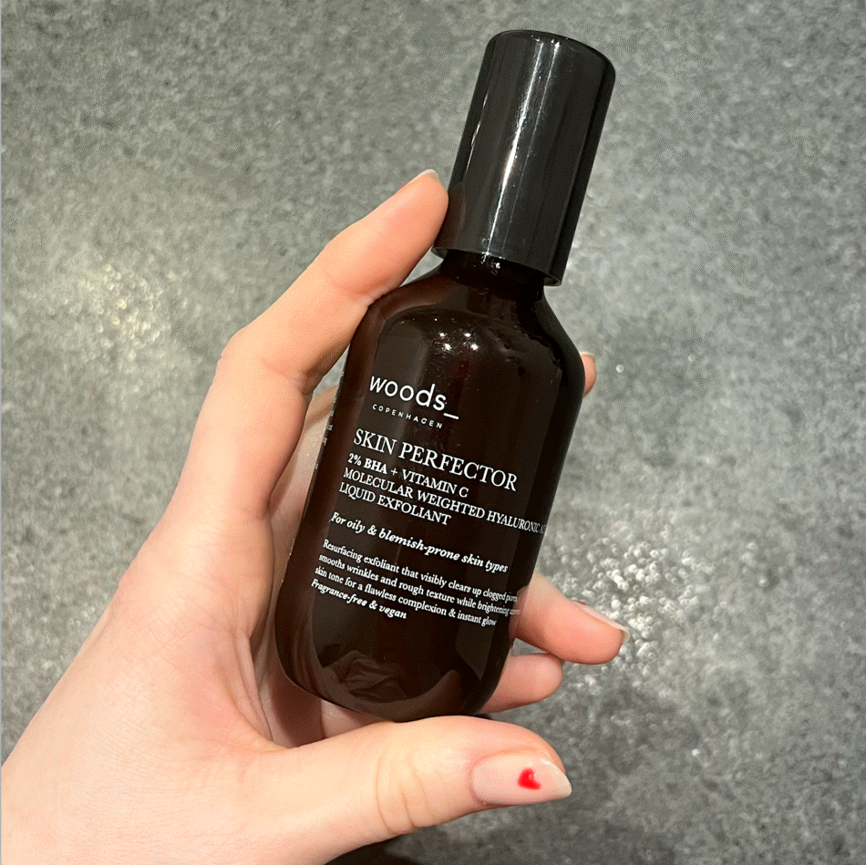 Nu skal vi til et produkt, som jeg virkelig har luret længe på, inden jeg skulle teste det – for det er altså ret unikt! Det drejer sig om Woods Copenhagen Skin Perfector, som er en mild men meget effektfuld eksfoliering, som du kan bruge på daglig basis. Det er dog vigtigt, at du vænner din hud til at bruge den – så start eventuelt med at bruge den hver anden dag og se, hvordan din hud reagerer.