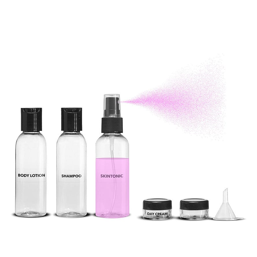 2 krukker til f.eks. creme, 3 flasker, hvor af den ene er med spray. Derudover en lille tragt som gør påfyldning nemmere.