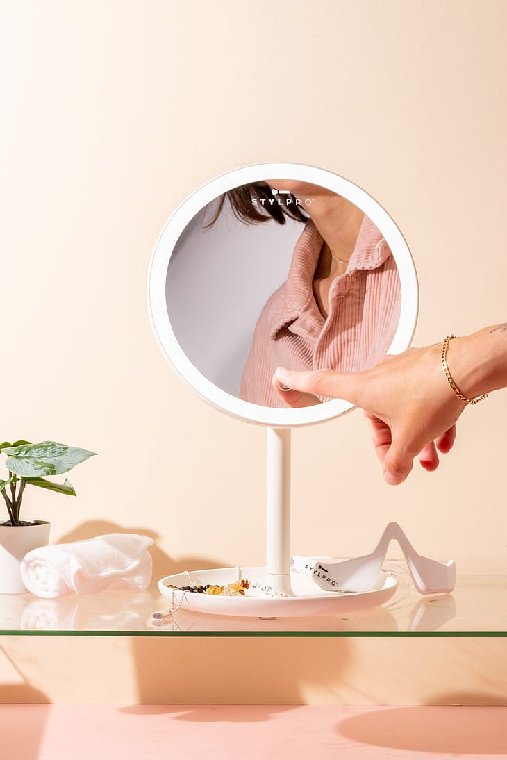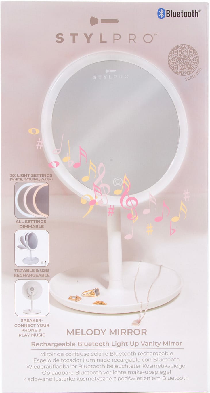 FOR DIN SIKKERHED OG FORTSAT GL�DE AF DETTE PRODUKT L�S ALTID INSTRUKTIONSVEJLEDNINGEN OMHYGGELIGT F�R BRUG. SIKKERHEDSRETNINGSLINJER: 1. STYLPRO� Melody Mirror er lavet af glas. H�ndter venligst med forsigtighed. 2. Kun til brug for voksne. Ikke beregnet til brug af b�rn. Dette er ikke et leget�j. 3. Uds�t ikke STYLPRO� Melody Mirror for direkte sollys uden opsyn. Reflekteret sollys kan for�rsage brand. 4. For at reng�re spejlets overflade skal du t�rre forsigtigt af med en mikrofiberklud eller glasrens. Brug IKKE et aerosol-spejlreng�ringsprodukt.5. Undg� at opbevare STYLPRO� Melody Mirror i varme, fugtige eller fugtige omr�der. 6. Hvis STYLPRO� Melody Mirror fejler eller er beskadiget p� nogen m�de, skal du straks stoppe med at bruge det. Kontakt STYLPRO� KUNDESERVICE. 7. Brug LED-lys med omtanke. Langvarig brug og langvarig eksponering af LED-lys i �jnene kan for�rsage skade. LED'er kan ikke udskiftes. 8. Holdes v�k fra v�sker, hvis STYLPRO� Melody Mirror bliver v�dt, m� det ikke bruges. Vigtige sikkerhedsinstruktioner: Ved brug af elektriske apparater skal der altid tages grundl�ggende sikkerhedsforanstaltninger, herunder f�lgende: l�s alle instruktioner. F�r apparatet tages i brug. Gem disse instruktioner. Holdes v�k fra vand. Dette produkt er ikke et leget�j. Stir ikke direkte ind i Lys. Brug kun indend�rs. Kun til husholdningsbrug. Fors�g ikke at �bne bagsiden af ??spejlet. Hvis det er n�dvendigt, konsulter en l�ge. Hold spejlet k�ligt og v�k fra kilder til direkte varme og sollys. Holdes v�k fra b�rn. Fare: For at reducere risikoen for elektrisk st�d: Sluk altid f�r reng�ring eller opbevaring. Advarsel: For at reducere risikoen for forbr�ndinger, elektrisk st�d, brand eller personskade: 1. L�s alle instruktioner f�r brug af apparatet. 2. For at beskytte mod elektriske farer m� du ikke bruge den, mens du bader eller under bruseren. 3. T�t opsyn er n�dvendigt, n�r et apparat bruges af eller i n�rheden af ??b�rn eller personer, der er svage eller handicappede af sygdom eller skade. 4. Betjen ikke dette apparat, hvis apparatet ikke fungerer korrekt eller er blevet tabt eller beskadiget p� nogen m�de. Returner apparatet til n�rmeste servicev�rksted for unders�gelse, elektrisk eller mekanisk justering eller reparation. Ingen reparationer b�r fors�ges af forbruger. 5. Brug kun apparatet til tilsigtet brug som beskrevet i denne instruktionsbog. Brugen af ??vedh�ftede filer anbefales ikke af Stylpro� kan for�rsage farer. 6. M� ikke bruges udend�rs eller arbejde, hvor der anvendes aerosolprodukter (spray), eller hvor der indgives ilt. 7. S�rg for, at stylpro� melodispejl ikke er i en position, hvor det kan reflektere sollys; reflekteret sollys kan for�rsage brand. 8. L�g dig ikke p� en bl�d overflade som f.eks. en seng, da spejlet kan blive overophedet. 9. S�rg for, at enheden er 'slukket' f�r opbevaring. 10. Brug ikke apparatet p� badev�relset eller i n�rheden af ??vand. 11. Anbring eller opbevar ikke apparatet, hvor det kan falde eller blive trukket ned i et kar eller en vask. 12. M� ikke placeres i eller tabes i vand eller andre v�sker. 13. Hvis apparatet falder i vandet, m� du ikke r�kke h�nden ned i vandet. 14. Kv�lningsfare p� grund af sm� dele. Ikke egnet til b�rn under 3 �r. Opbevaring: S�rg for, at enheden er 'slukket' f�r opbevaring. Tryk �n gang p� t�nd/sluk/d�mper-knappen, og lyset slukker. S�rg for, at spejlet er frakoblet enhver str�mforsyning. S�rg for, at direkte sollys ikke rammer spejlet, n�r det efterlades uden opsyn. Lad afk�le til stuetemperatur f�r opbevaring. Anbring et k�ligt, t�rt omr�de uden for b�rns r�kkevidde, hvor spejlet ikke vil blive beskadiget.