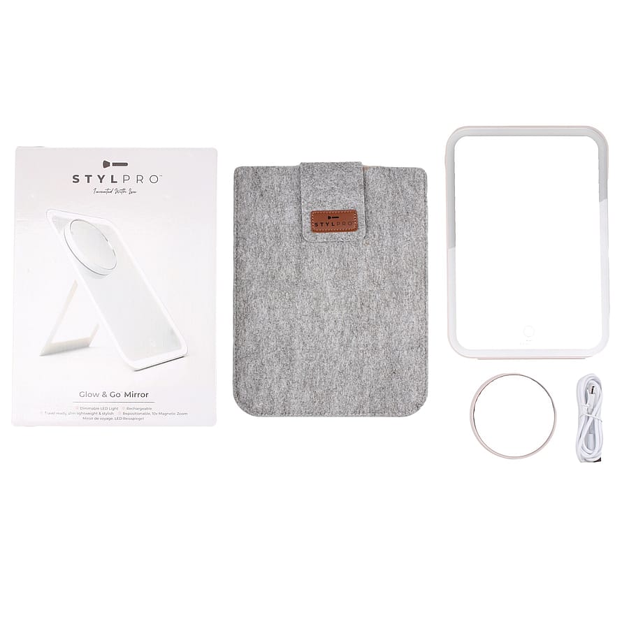 Spejlet er udstyret med et foldbart stativ, en USB-mikroopladningsport og et beskyttelseshylster, hvilket gør det nemt at tage med dig overalt. Uanset om du er på rejse, på arbejde eller bare har brug for et hurtigt touch-up, er STYLPRO Glow and Go Travel Mirror den perfekte løsning.